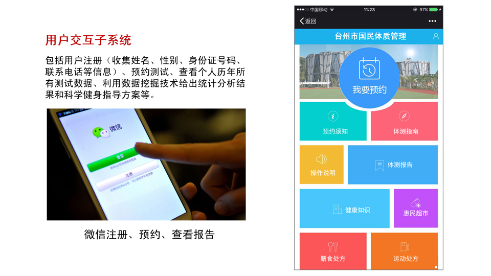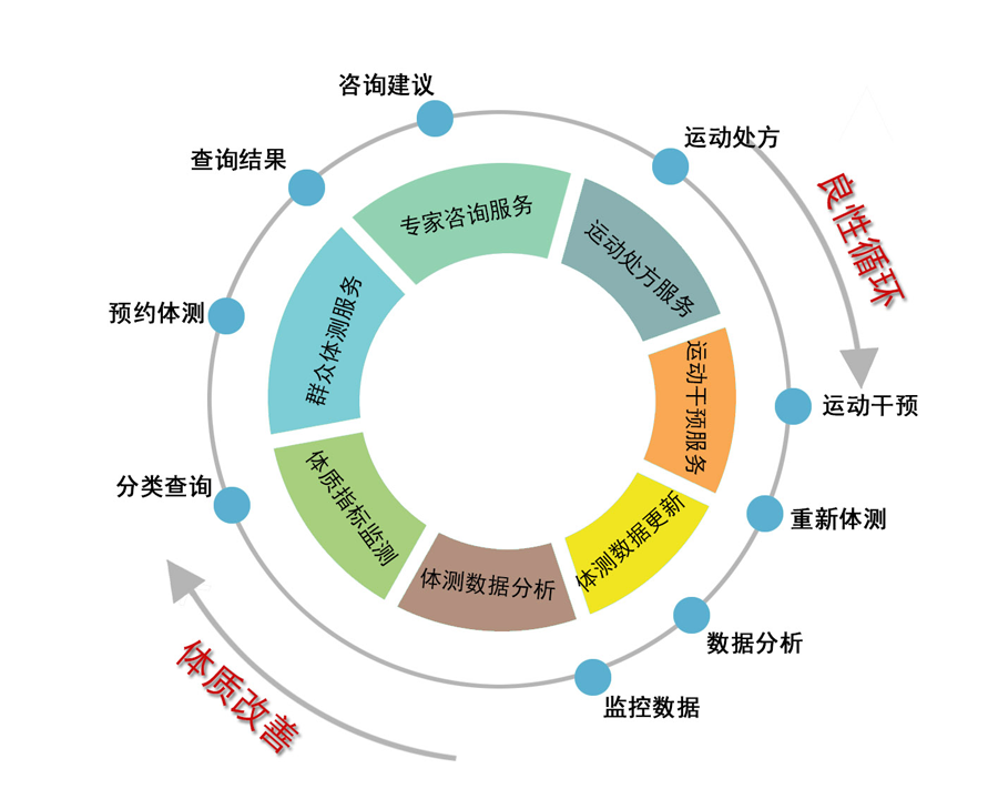 构建国民体质改善服务O2O 平台,通过融合多种的线上、线下互动服务体系,实现“运动干预”和“体医结合”等体育科技成果的应用,O2O 平台主要包括群众体测服务、专家咨询服务、运动处方服务、运动干预服务、运动风险评估、体质数据监测和指标分析等功能,通过大数据监测分析以及多种O2O 综合服务,让国民体质改善实现良性循环,逐渐提升全市的运动医学等建设水平。