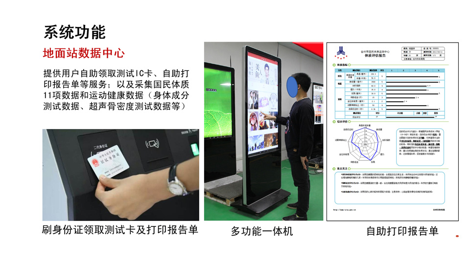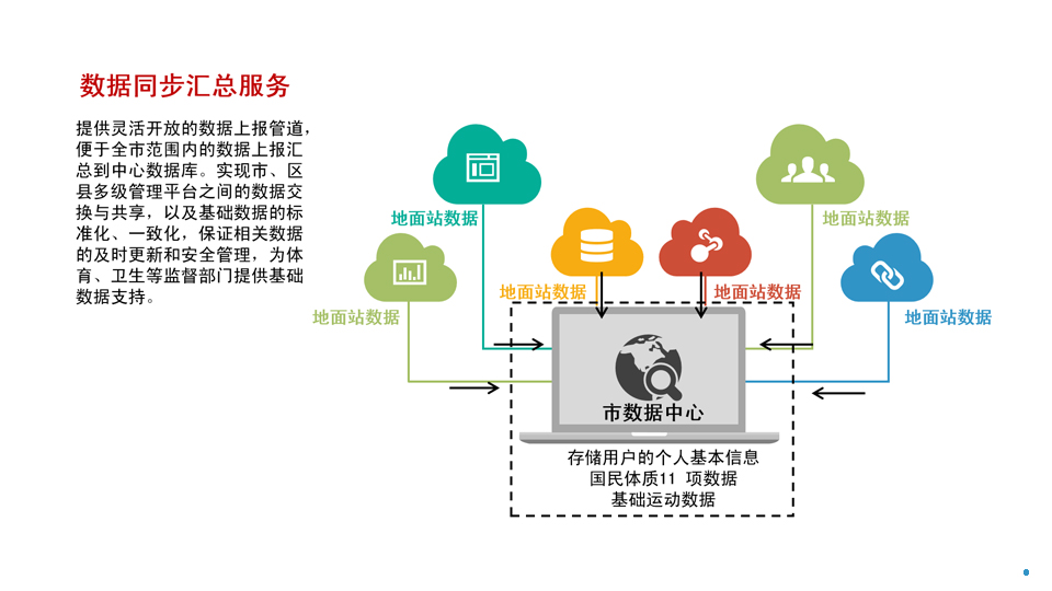 国民体质管理系统是一个分布式的综合应用系统,包括地面站子系统、用户交互子系统、数据同步与汇总服务、系统后台管理子系统、综合报表服务、数据存储服务、监控系统七大部分。